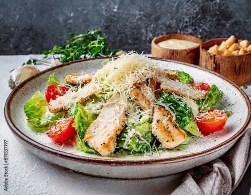 A delicious chicken caesar salad with parmesan cheese, dressing and croutons. plate of organic healthy meal