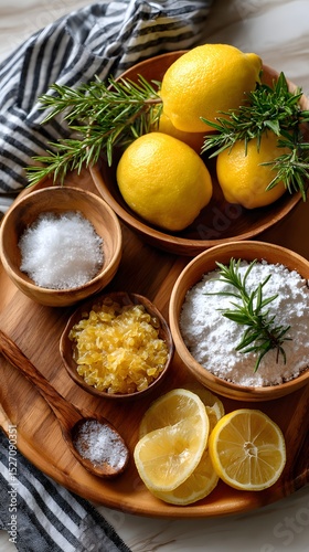 A delicious display of fresh lemons, herbs, salt, and sugar, creating a mouthwatering culinary scene