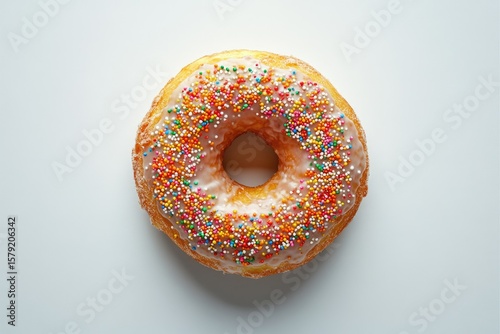 A delicious donut topped with a creamy icing and rainbow sprinkles.