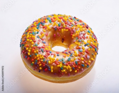 a delicious doughnut topped with colorful sprinkles. It has a glazed surface and a hole in the middle, a tempting treat.