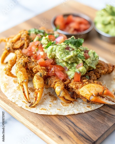 A delicious fried crab served on a tortilla with guacamole and salsa.