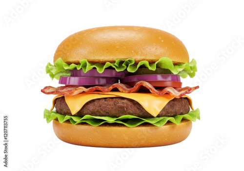 A delicious gourmet burger with layers of lettuce, red onions, melted cheese, crispy bacon, and a juicy patty, sandwiched in a golden bun, isolated on a white background
