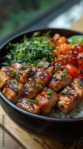 A delicious grilled chicken bowl features tender chicken pieces glazed with sauce, served with fresh tomatoes and greens atop fluffy rice in a casual dining space