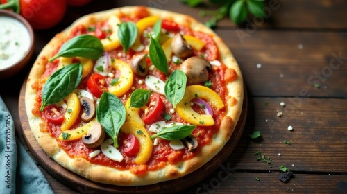 A Delicious Homemade Vegetarian Pizza with Fresh Seasonal Vegetables and Herbs on a Rustic Wooden Table