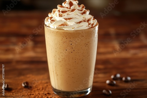A delicious iced coffee blended drink topped with whipped cream and cinnamon.