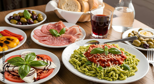 A delicious Italian feast featuring pesto pasta, Caprese salad, cured meats, olives, and a glass of red wine.