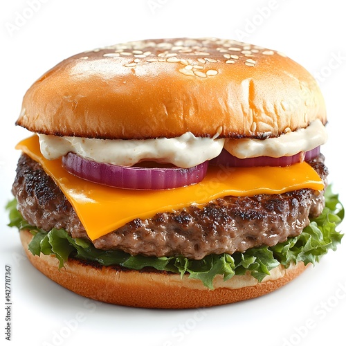 A delicious juicy cheeseburger with melted cheddar cheese, red onion, lettuce, and creamy sauce on a sesame seed bun.