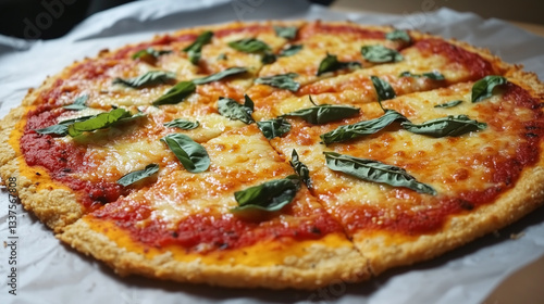 A delicious lactose-free pizza with dairy-free cheese, fresh basil, and a crispy golden crust