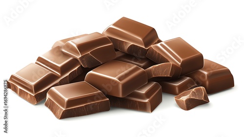 A delicious pile of glossy milk chocolate squares broken from a bar, isolated illustration