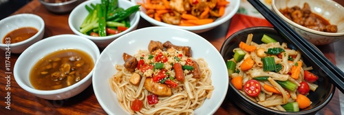 A delicious serving of Chinese food noodles, garnished with fresh vegetables and placed on a wooden table, Asian, lunch, traditional
