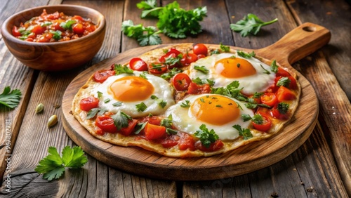 A delicious serving of Huevos a la Mexicana, garnished with a sprig of fresh parsley, on a distressed wooden cutting board