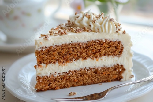 A delicious slice of carrot cake with cream frosting and nuts, served on a white plate beside a cup