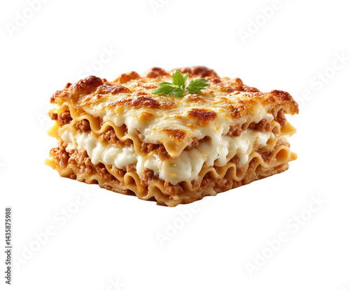 A delicious slice of lasagna, with layers of pasta, meat sauce, and melted cheese, garnished with a fresh herb. Concept of Italian cuisine and comfort food.