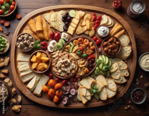 A delicious spread of appetizers and snacks arranged artfully on a wooden platter, rustic platter, harvest snack