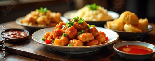 A delicious spread of Chinese takeout food on a table, including sweet and sour chicken, spring rolls, fried rice, and dumplings, ready for a satisfying supper , egg, chinese cuisine, home cooking