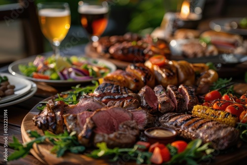 A delicious spread of grilled meats, including steak and chicken, with fresh vegetables and drinks, set on a wooden table for a barbecue feast.