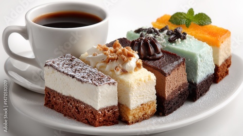 A delicious variety of cake slices with coffee for breakfast, isolated on a white background