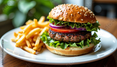 A delicious vegan burger with fries on a plate.