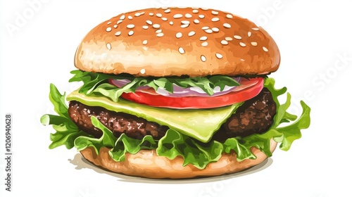A delicious veggie burger with fresh greens and avocado, isolated on a white background, catering to fast food lovers with a healthy twist.