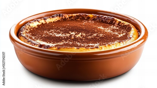 A delicious-looking creamy dessert, generously dusted with cocoa powder, sits in a rustic terracotta bowl.