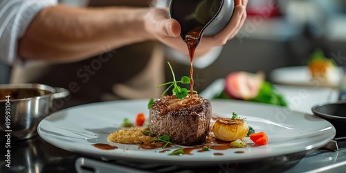 A deliciously cooked steak drizzled with rich sauce, accompanied by vegetables, beautifully presented on a white plate.