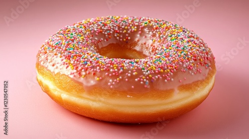 A deliciously glazed donut adorned with colorful sprinkles, set against a pink background with space for text, close-up shot