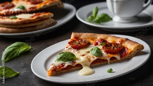 A Deliciously Hot Juicy Pepperoni Pizza Slice with Melting Melted Stringy Cheese Being Served on a White Plate with a Side of Fresh Green Basil Leaves
