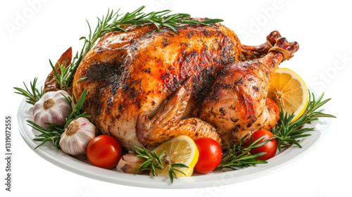 A deliciously roasted turkey with golden skin, garnished with rosemary, fresh tomatoes, garlic, and lemon slices, cut out and isolated on a transparent background, served on a white plate.