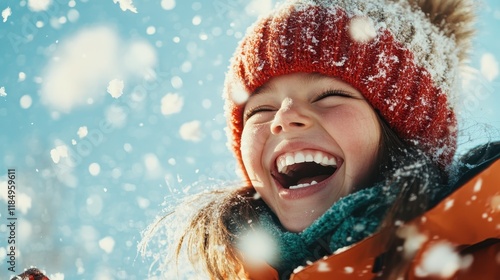 A delighted girl laughs heartily amidst a flurry of snow, showcasing the joy and excitement of winter playtime in her vibrant outerwear against the blue sky.