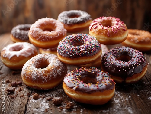 A delightful assortment of assorted donuts, glazed, sprinkled, and frosted, arranged artfully on a rustic wooden surface.