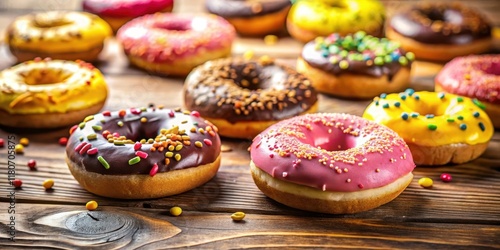 A delightful assortment of colorful frosted donuts, generously sprinkled with vibrant candy bits, arranged on a rustic wooden surface.