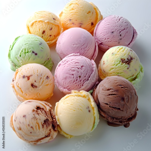A delightful assortment of colorful ice cream scoops in various flavors sits together on a white background.