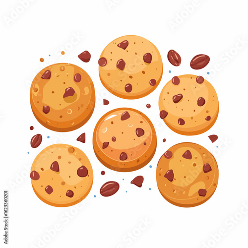 A delightful assortment of scattered chocolate chip cookies. Sweet homemade pastry illustration for bakery and food concepts.