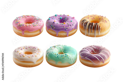 A delightful assortment of six vibrant colorful pastel glazed donuts an irresistible collection of sweet bakery treats transparent background