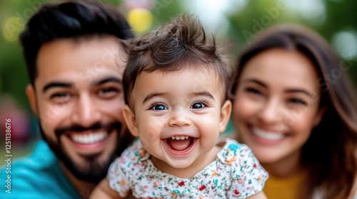 A delightful baby grins widely while being held by smiling parents, encapsulating the essence of love and joy within a warm family atmosphere brimming with happiness.