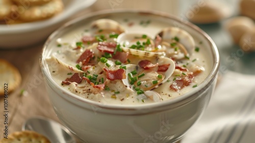A delightful bowl of clam chowder soup garnished with crispy bacon bits and chopped chives, Clam chowder bowl centered