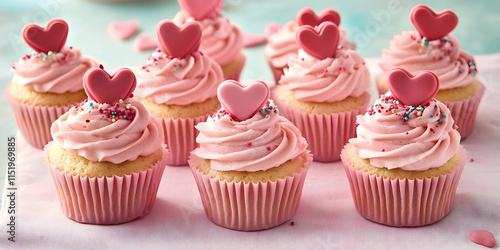 A delightful display of pink frosted cupcakes topped with heart-shaped decorations.