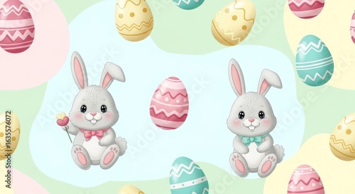 A delightful easter pattern featuring cute bunnies and colorful eggs, perfect for adding a festive touch to your holiday designs and celebrations, with a sweet and playful style