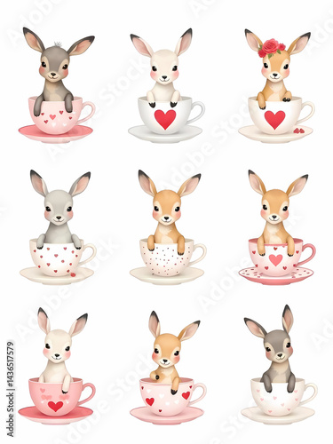 A delightful illustration of cute baby animals, deer and bunnies, in teacups decorated with hearts.