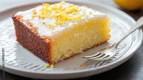 A delightful lemon cake with a zesty glaze and lemon zest on top, displayed on a white ceramic plate with a fork