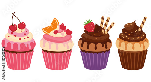 A delightful quartet of colorful cupcakes, each uniquely adorned with vibrant frosting, fresh fruits, and chocolate accents, perfect for celebrations.