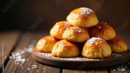 A delightful stack of golden-brown, sweet buns, delicately dusted with powdered sugar, rests on a rustic wooden board. The warm lighting enhances the baked goods' appealing texture and aroma.