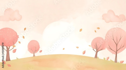 A delightful watercolor landscape featuring trees and falling leaves in autumn