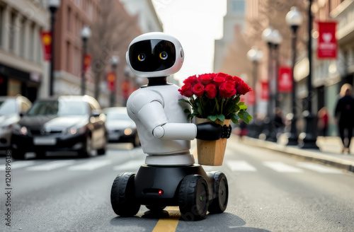 A delivery robot delivers a bouquet of flowers. gift delivery. valentine's day