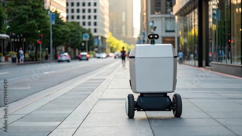 A delivery robot navigates a city street, showcasing urban technology in action.