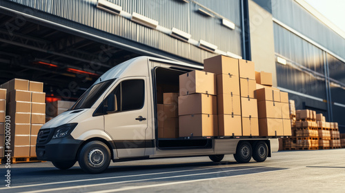 A delivery van, packed with boxes, is parked outside a warehouse. The truck is delivering online orders, purchases, and wholesale goods.