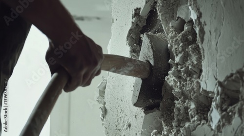 A demolition worker using a sledgehammer to break a wall. Featuring strength and technique