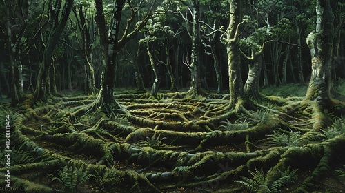 A Dense Ancient Forest with Towering Trees and Lush Greenery, Featuring Thick Canopy and Sunlight Filtering Through the Foliage in a Timeless, Enchanting Woodland Scene