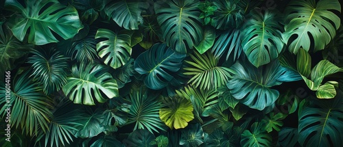 A dense arrangement of green tropical leaves creating a lush, vibrant backdrop.