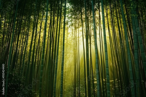 A dense bamboo forest with shafts of golden sunlight streaming through the tall, green stalks.